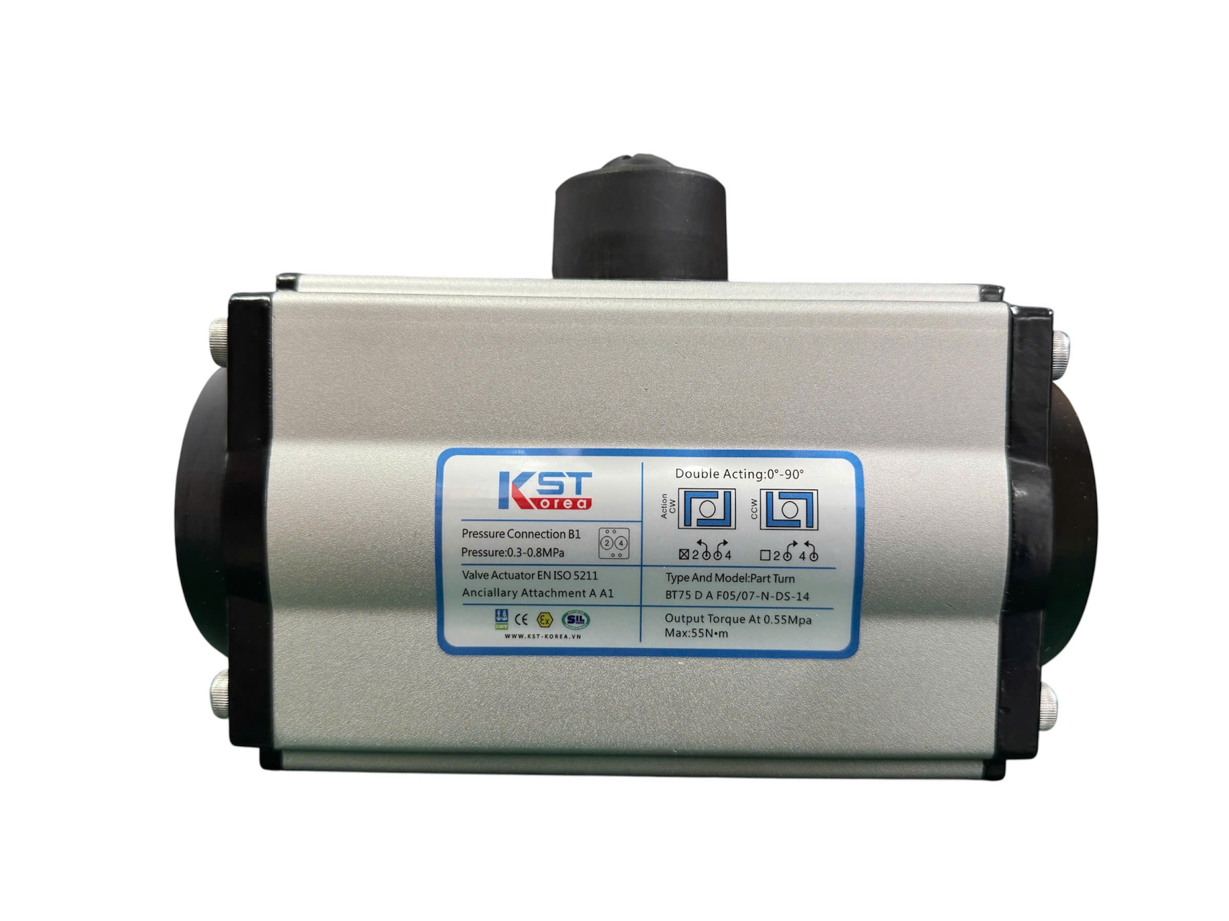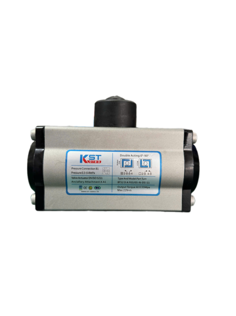 “Bộ điều khiển khí nén KST” thực chất là bộ truyền động khí nén (Pneumatic Actuator) của thương hiệu KST (Hàn Quốc). Đây là một thiết bị quan trọng trong các hệ thống tự động hóa công nghiệp, có chức năng chuyển đổi năng lượng khí nén thành chuyển động cơ học (thường là chuyển động quay 90 độ hoặc chuyển động tuyến tính) để điều khiển các loại van công nghiệp như van bi, van bướm, van xiên, van cầu, v.v.