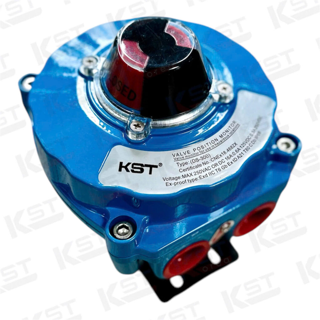 Hộp công tắc giới hạn (Limit Switch Box) chống cháy nổ model DS300 của hãng KST (thường liên quan đến KST Korea hoặc các dòng thiết bị giám sát van từ các nhà sản xuất thiết bị truyền động khí nén) là thiết bị quan trọng để phản hồi trạng thái đóng/mở của van về hệ thống điều khiển trung tâm (PLC).
