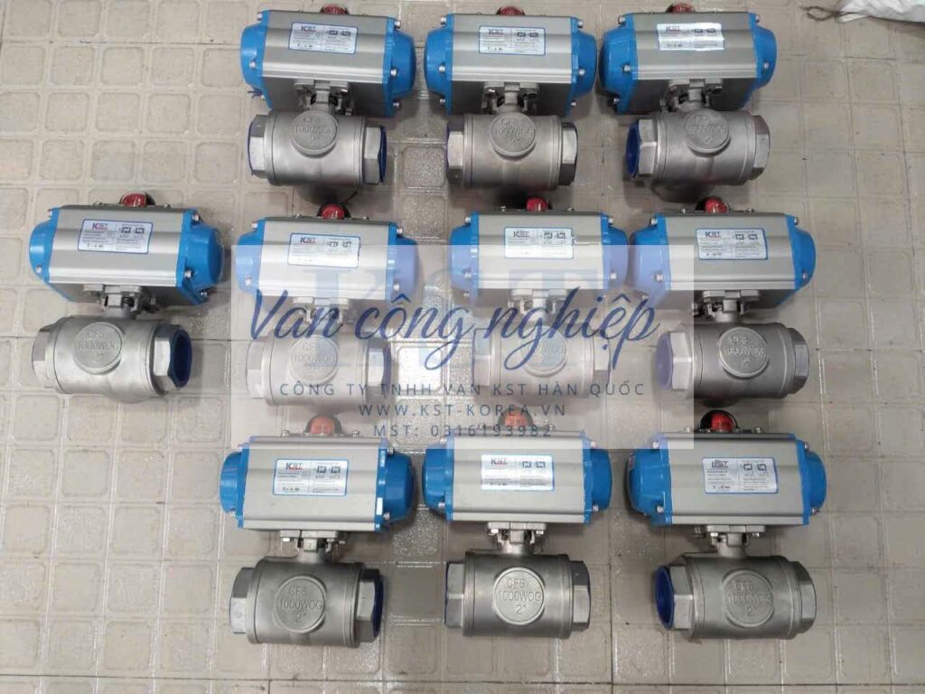 Van bi 3 ngã nối ren điều khiển khí nén KST-AT là một loại van công nghiệp chuyên dụng, được thiết kế để điều khiển dòng chảy của chất lỏng hoặc khí theo nhiều hướng khác nhau trong hệ thống đường ống. Đây là sự kết hợp giữa thân van bi 3 ngã với bộ truyền động khí nén (actuator) của thương hiệu KST, trong đó “AT” thường là ký hiệu của dòng bộ truyền động khí nén tác động kép (Double Acting) hoặc tác động đơn (Spring Return) của KST.