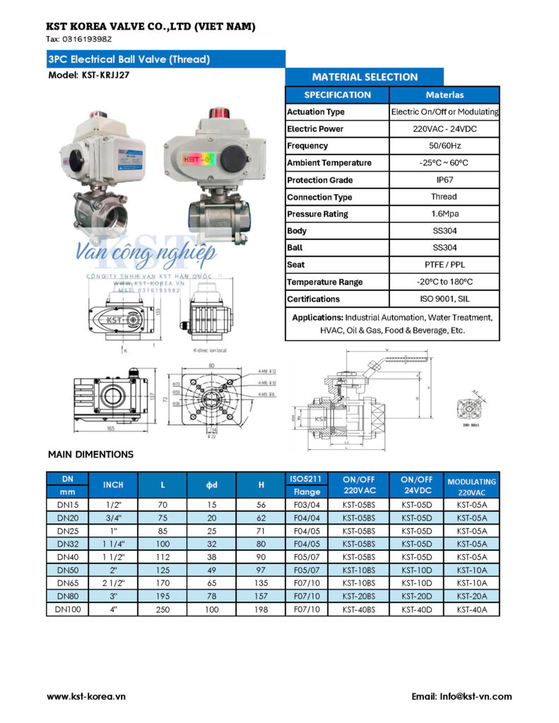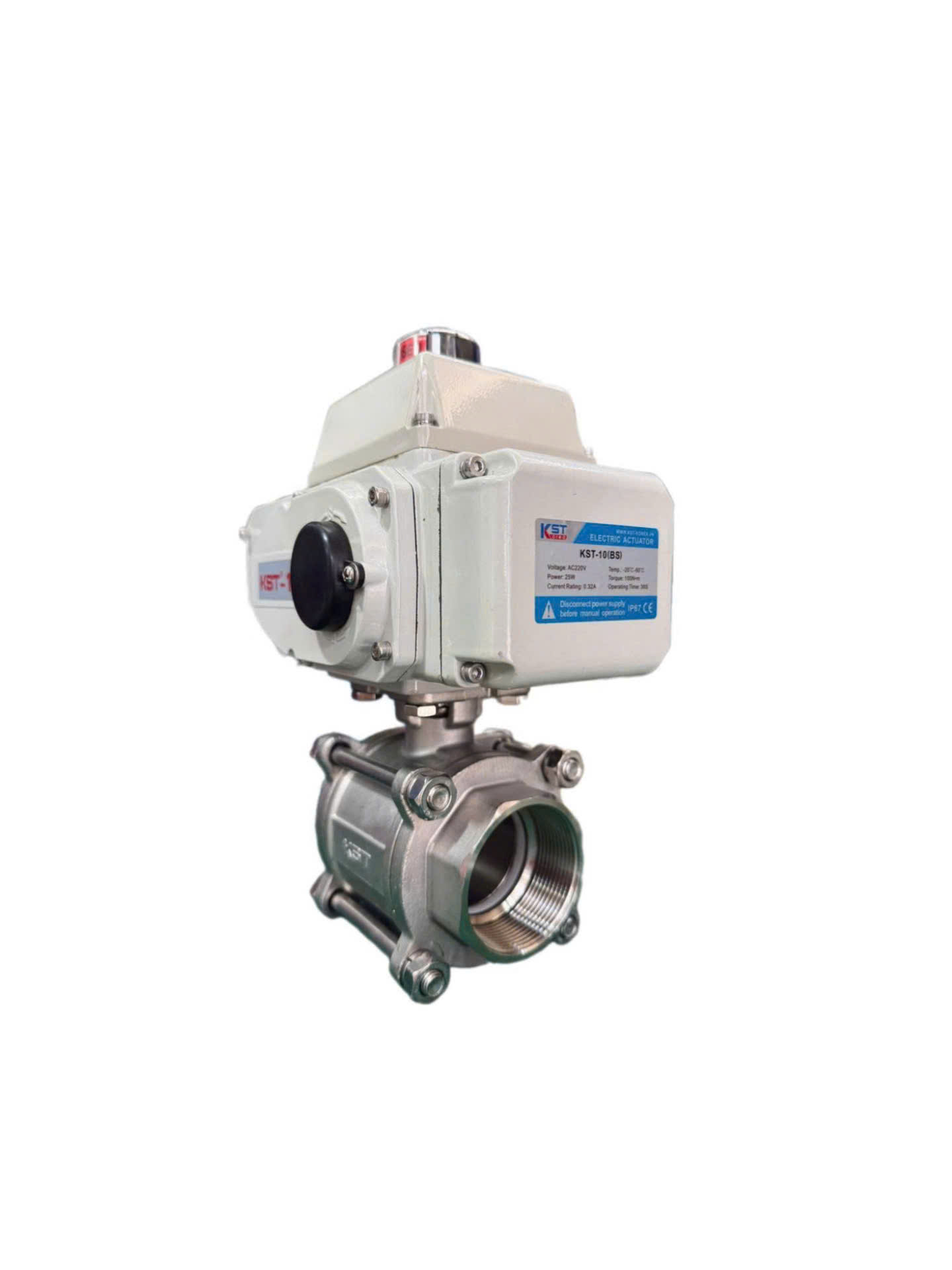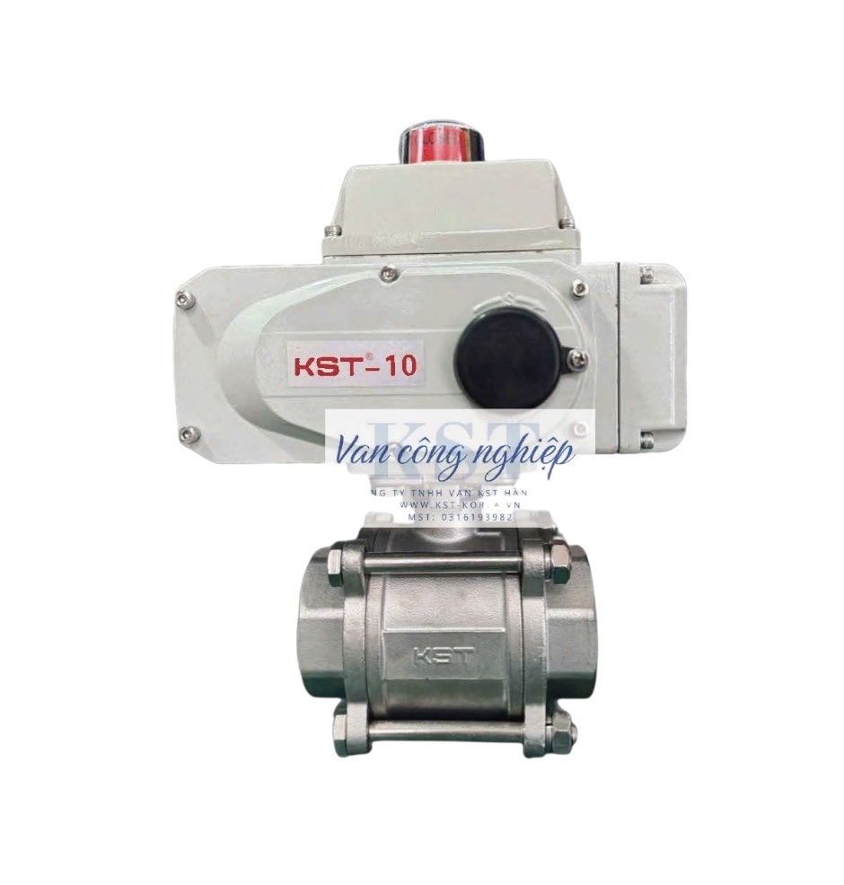 Van bi nối ren điều khiển điện của KST là giải pháp tự động hóa phổ biến cho các đường ống kích thước nhỏ và vừa. Dòng van này kết hợp giữa thân van bi (thường là inox 304/316) và bộ truyền động điện KST giúp vận hành đóng mở từ xa thông qua tủ điện hoặc hệ thống PLC.