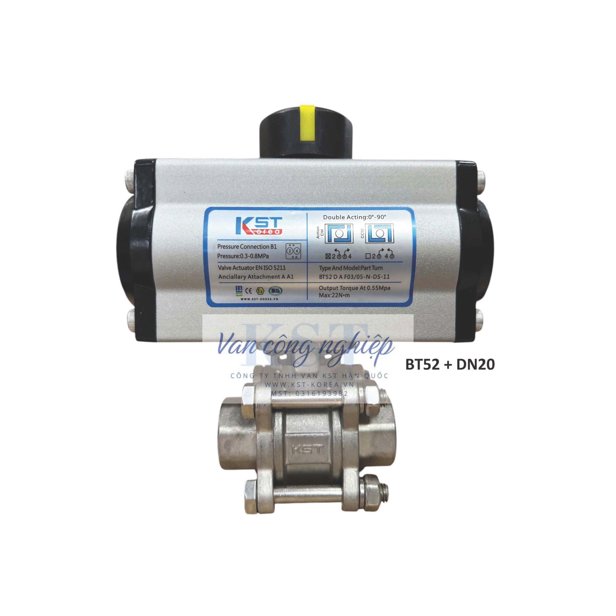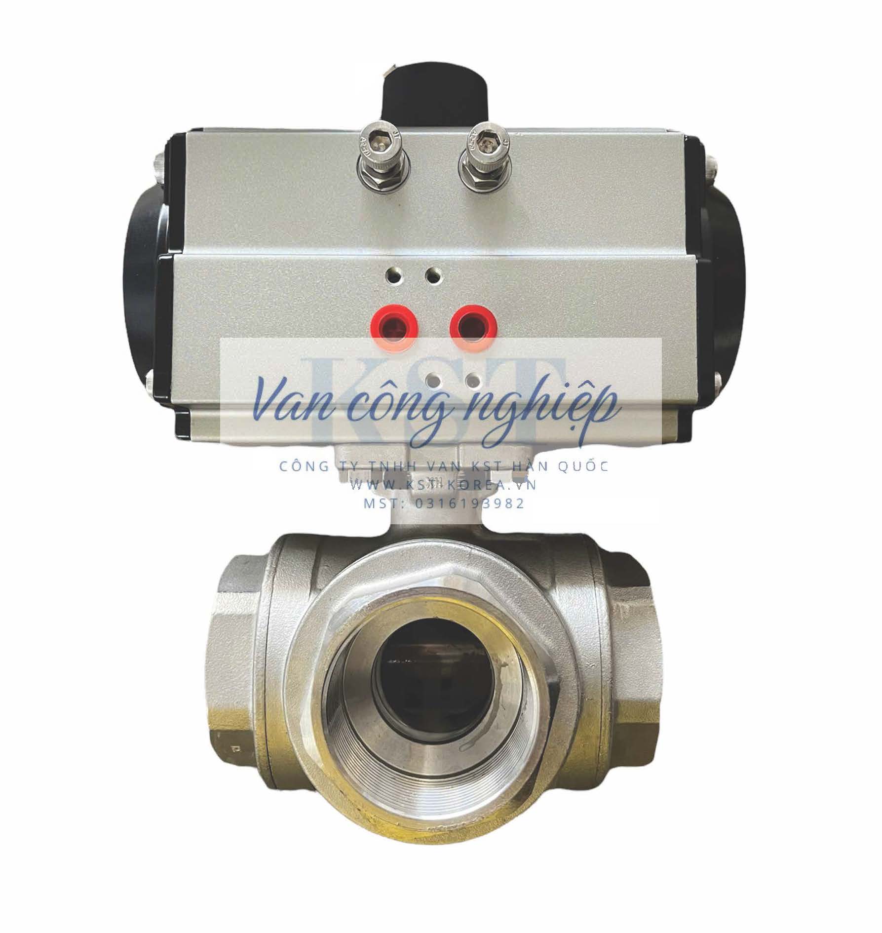 Van bi nối ren điều khiển khí nén KST BT là loại van bi tự động sử dụng áp lực khí nén để điều khiển quá trình đóng mở. “KST” là thương hiệu nổi tiếng của Hàn Quốc chuyên sản xuất các loại van công nghiệp và bộ truyền động, còn “BT” thường đề cập đến dòng bộ truyền động khí nén (pneumatic actuator) của hãng KST.