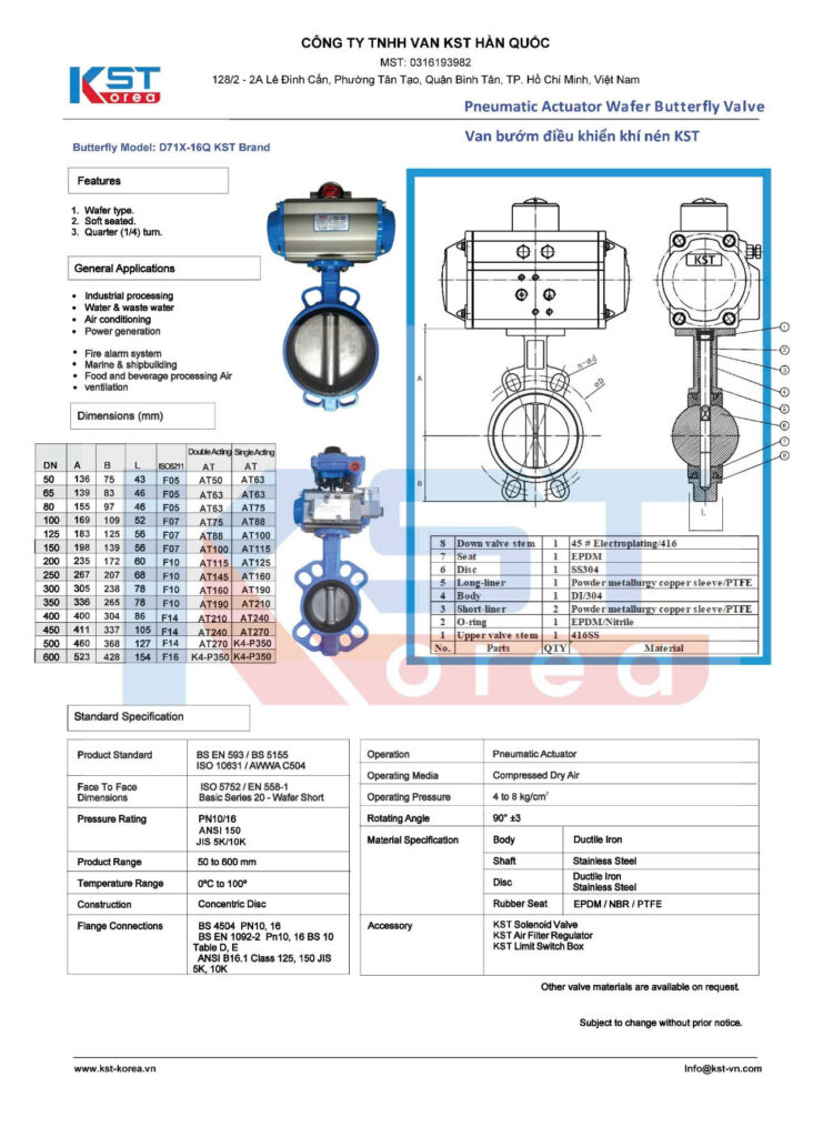 Đây là sự kết hợp của một thân van bướm bằng gang và một bộ truyền động khí nén KST (tên viết tắt của Korea System Technology), trong đó “AT” thường chỉ dòng bộ truyền động tác động kép (Double Acting) hoặc đôi khi cũng bao gồm cả tác động đơn (Spring Return) của hãng KST.