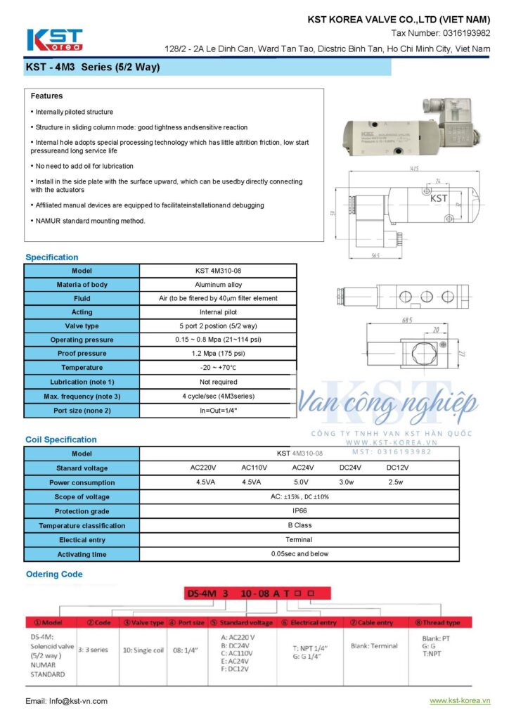 Van điện từ 4M310-08 KST là dòng van khí nén 5/2 (5 cổng, 2 vị trí) được thiết kế theo tiêu chuẩn Namur. Đây là loại van chuyên dụng để lắp trực tiếp lên các bộ truyền động khí nén (Pneumatic Actuator) của van bi hoặc van bướm trong các hệ thống tự động hóa.