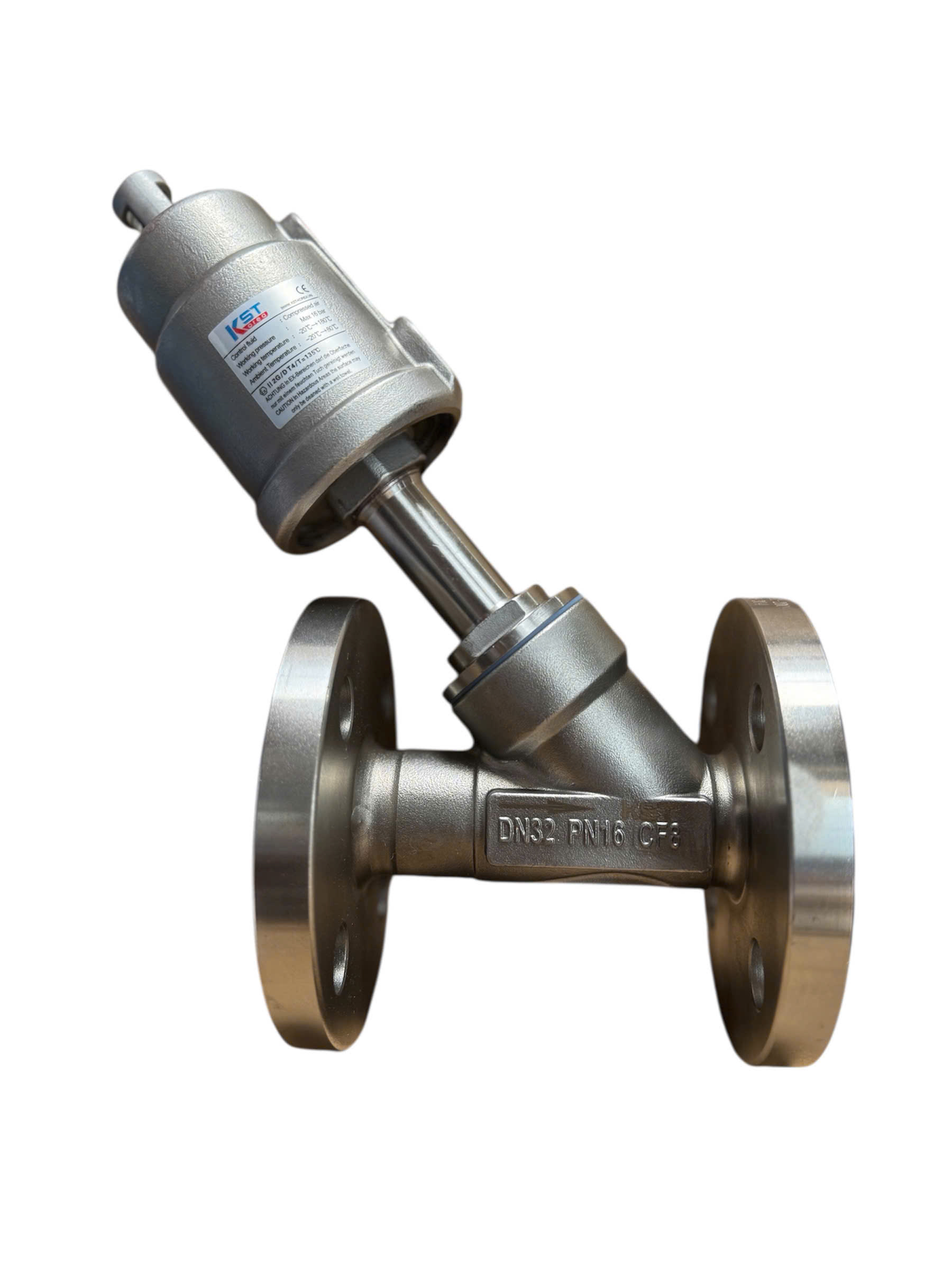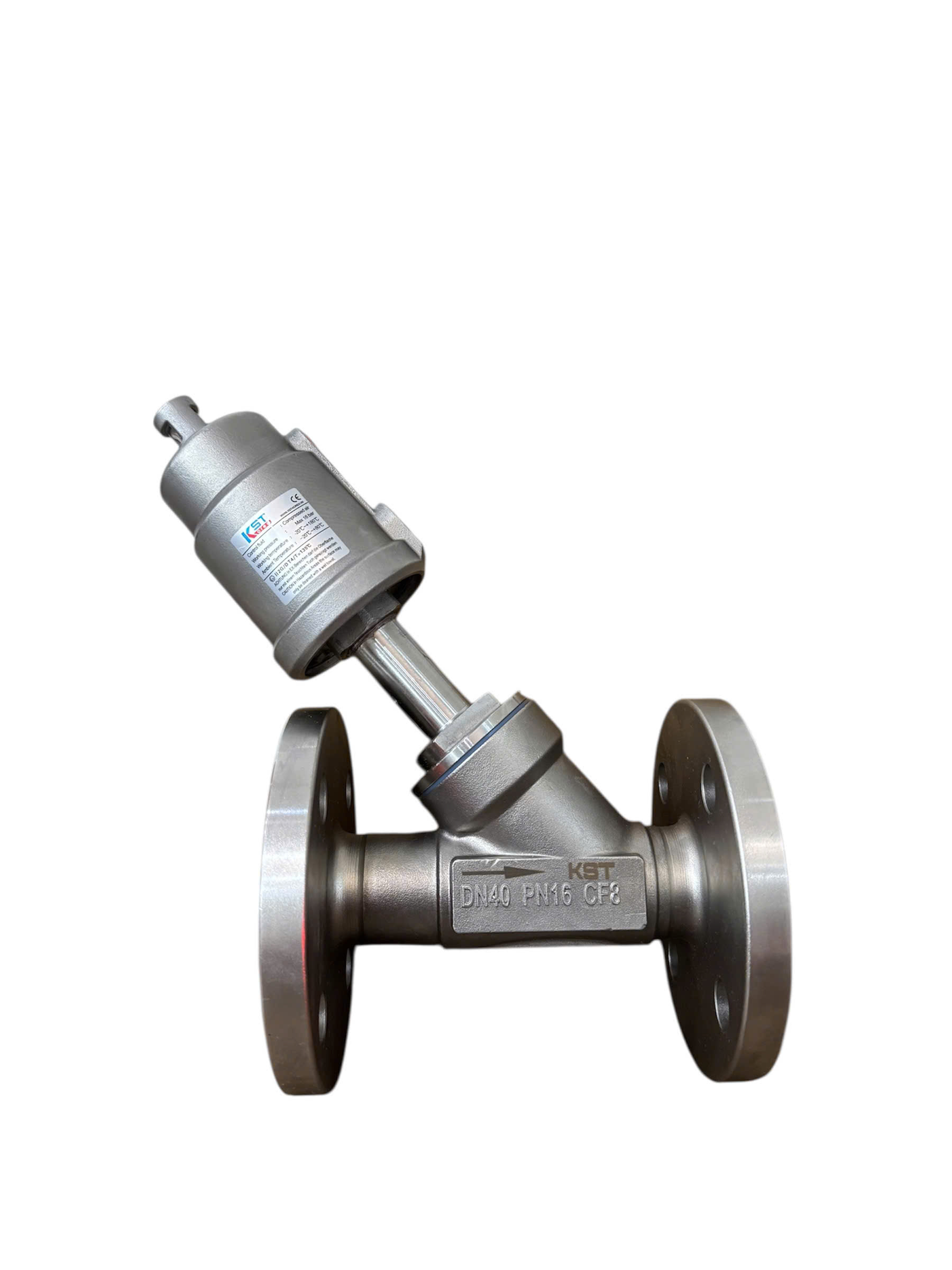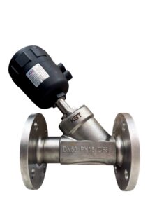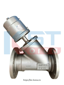 Van xiên mặt bích khí nén KST là một loại van góc (van chữ Y) được điều khiển tự động bằng khí nén, sử dụng cơ cấu truyền động khí nén (actuator) để đóng hoặc mở van. Van này nổi bật với kiểu kết nối mặt bích và là sản phẩm của thương hiệu KST (Korea Standard Technology) đến từ Hàn Quốc.
