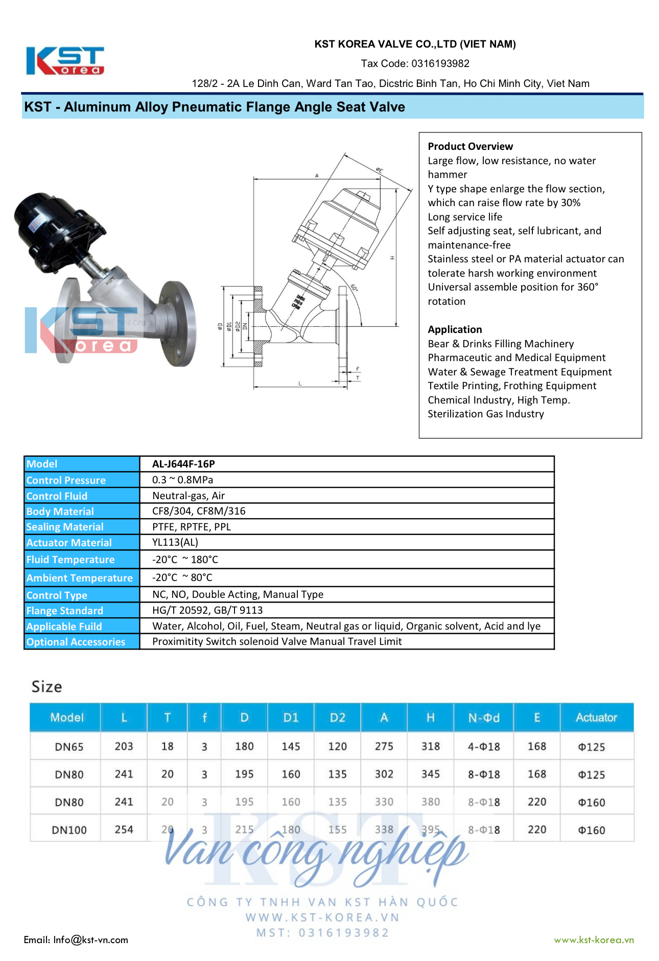Dòng Van xiên mặt bích khí nén KST (Đầu nhôm) là sự kết hợp hoàn hảo giữa độ bền cơ học của kim loại và trọng lượng tối ưu. Đây là lựa chọn nâng cấp từ đầu nhựa nhưng có mức giá “dễ thở” hơn so với đầu Inox toàn bộ.